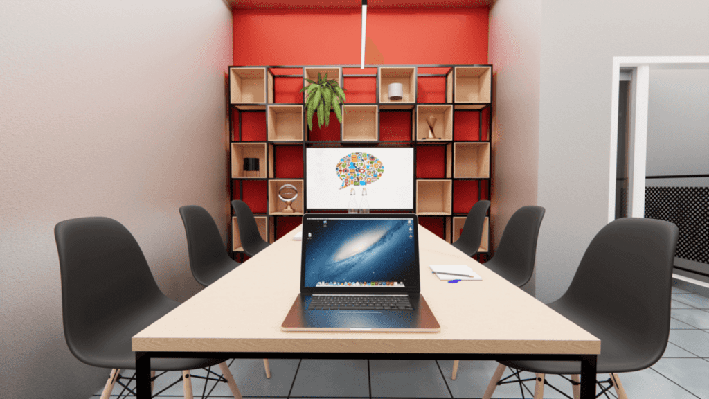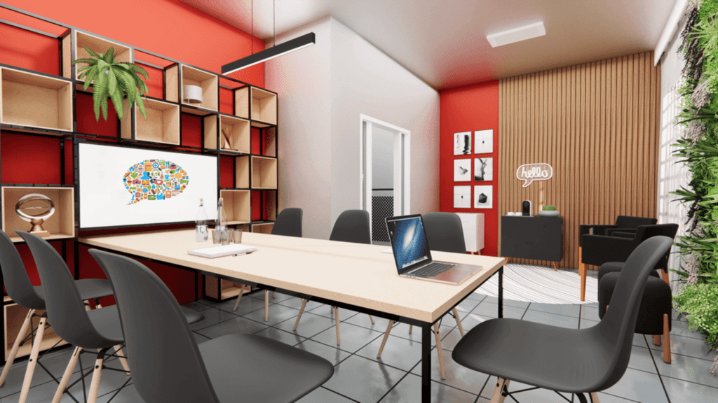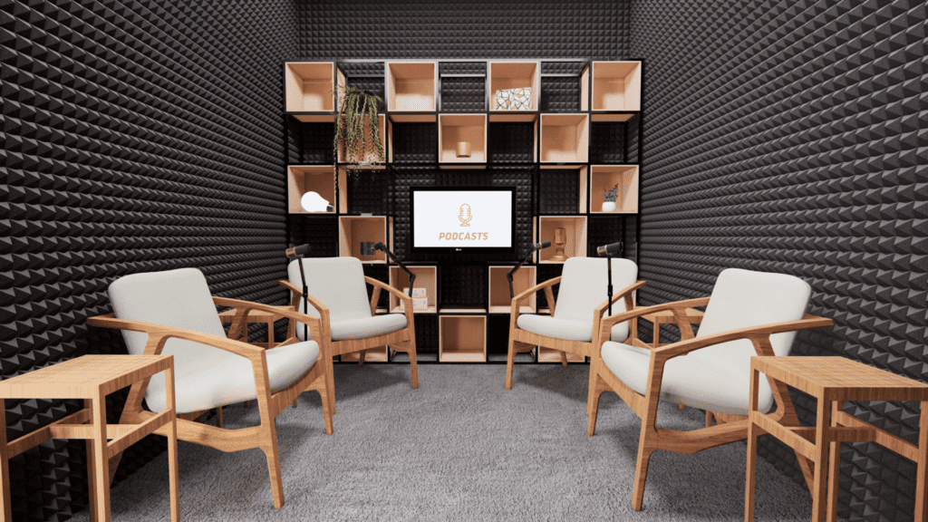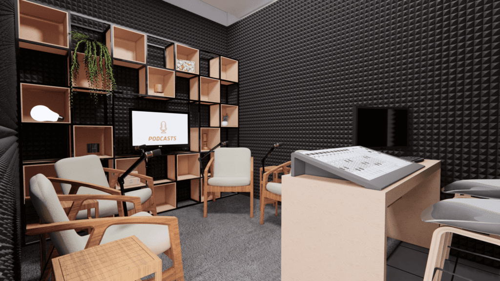 Projeto de interiores para sala de reunião e estúdio de podcast com 32,90 m², no estilo contemporâneo e toques do estilo industrial.