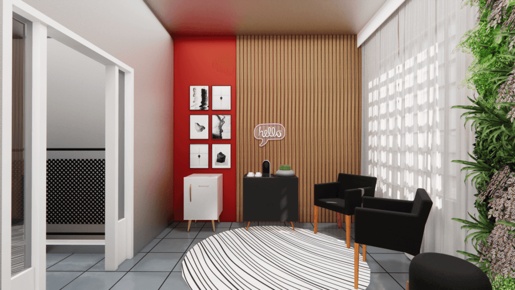 - Estúdio com espaço adaptável à necessidade de cada cliente, podendo alterar parte do layout (poltronas) e decoração da estante.