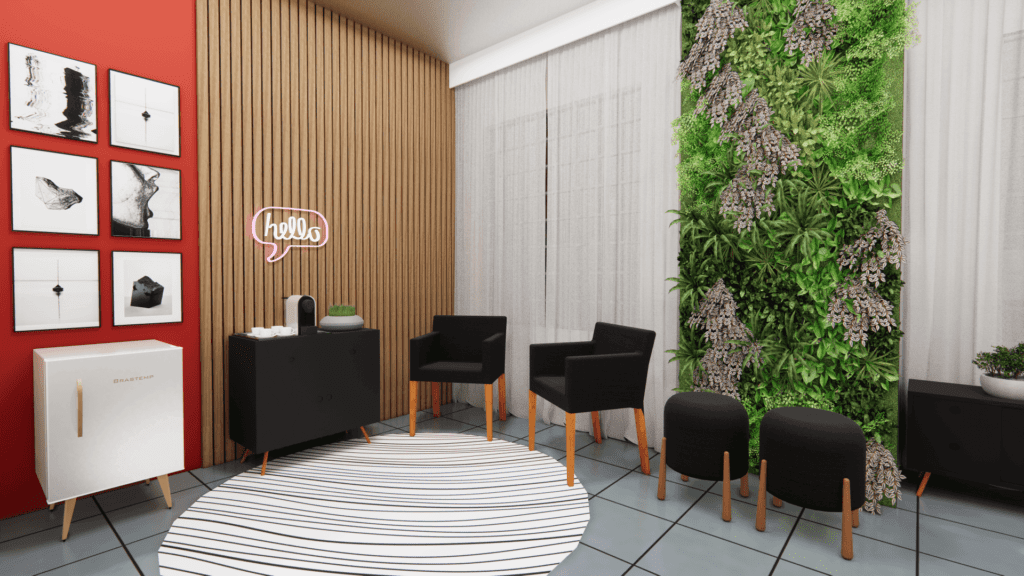 - Uso de jardim vertical preservado para trazer a beleza e o frescor das plantas para dentro do ambiente;