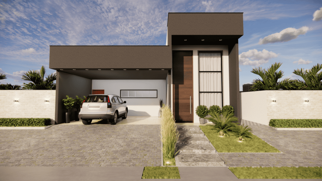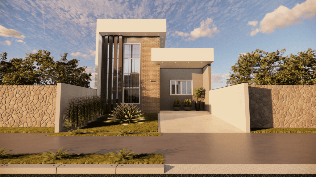 Casa térrea de estilo contemporâneo com 100 m². Foi pensada para um casal acima dos 60 anos. A planta, de 100 m², projeta um imóvel térreo, com área social compacta, integrada à cozinha e à área gourmet. Além disso, há um quarto extra para acomodar os filhos do casal, quando eles vêm visitar os pais. O resultado foi um sucesso e contemplou todos os desejos do casal para o imóvel.