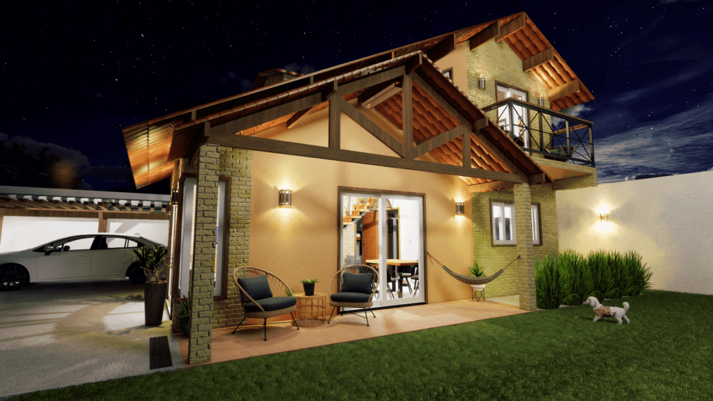 Casa térrea em chácara, no estilo rústico, com 290 m². Ela foi projetada para um casal sem filhos e com o objetivo de ser uma casa de veraneio, para proporcionar lazer e descanso. Os atrativos do projeto são a piscina e a grande área gourmet para receber a família e os amigos.